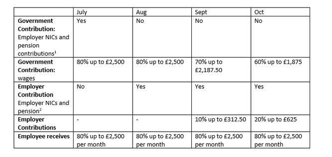 • In October, the government will pay 60% of wages up to a cap of £1,875 for the hours the employee does not work. Employers will pay ER NICs and pension contributions and 20% of wages to make up 80% total up to a cap of £2,500.