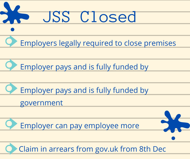 The Job Support Scheme (JSS) has been separated in to two to cover businesses that are legally required to close (JSS Closed) and businesses with reduced demand (JSS Open.) A business is able to use both schemes at the same time if necessary (if offices are in different restriction levels across the country) and can move between the two.