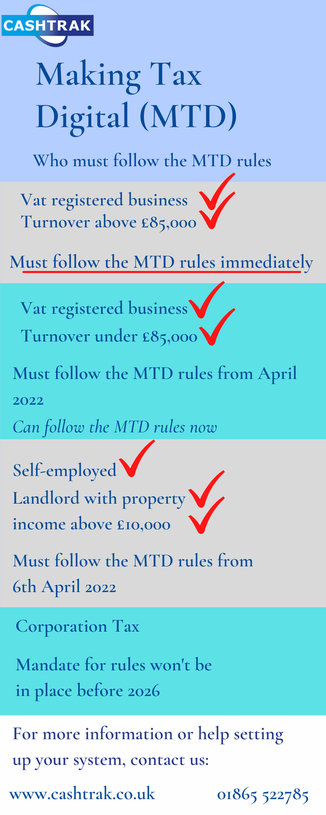 We already have a number or self-employed businesses and landlords that we provide an MTD compliant service for in readiness for the deadline, moving over now ensures any potential problems are resolved sooner. Contact us for more information by clicking here or call us on 01865 522785.
