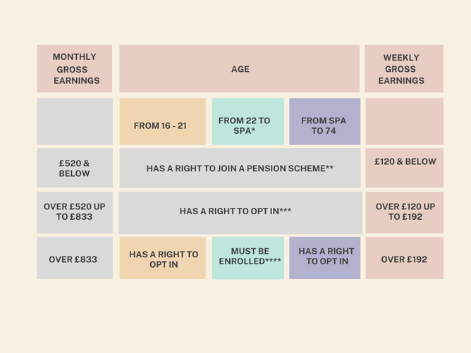 *** Has a right to opt in = if they ask to be put into a pension scheme, the employer must put them in a pension scheme that can be used for automatic enrolment and pay regular contributions.